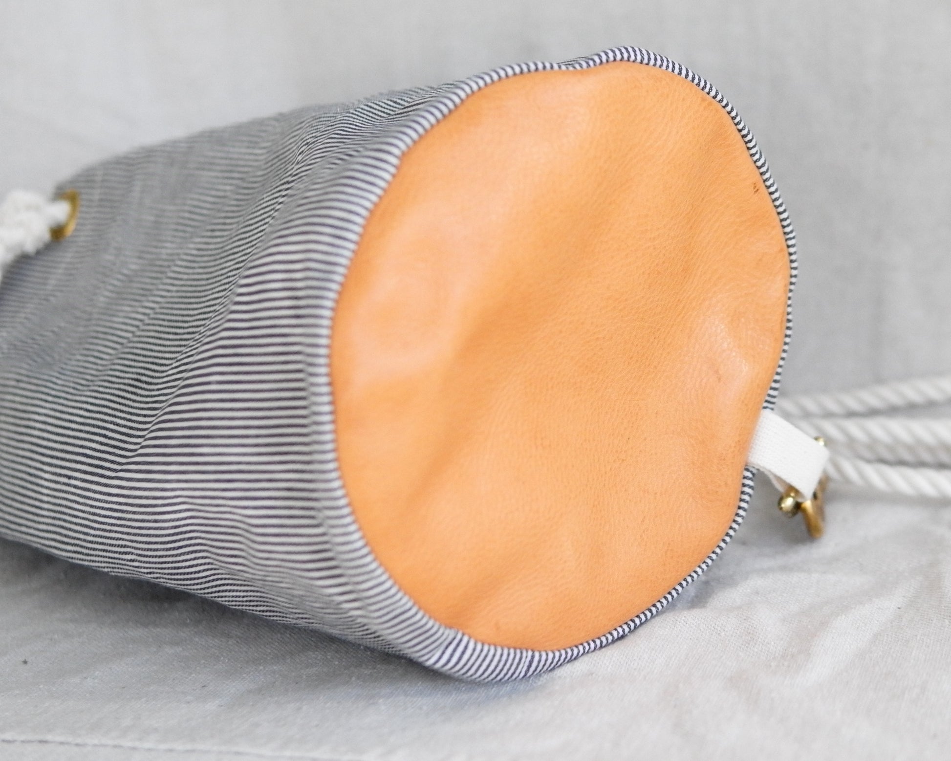 The Bucket Bag. A perfect throw-over-your-shoulder sack for spring and summer. Minimalist design for an easy grab-and-go feel - based on a classic style used by sailors. Fully lined, leather bottom, interior zipper pocket, and reclaimed climbing rope straps. Perfect for a day at the beach, a cafe, on a boat, or in the woods. I use mine as a knitting bag!