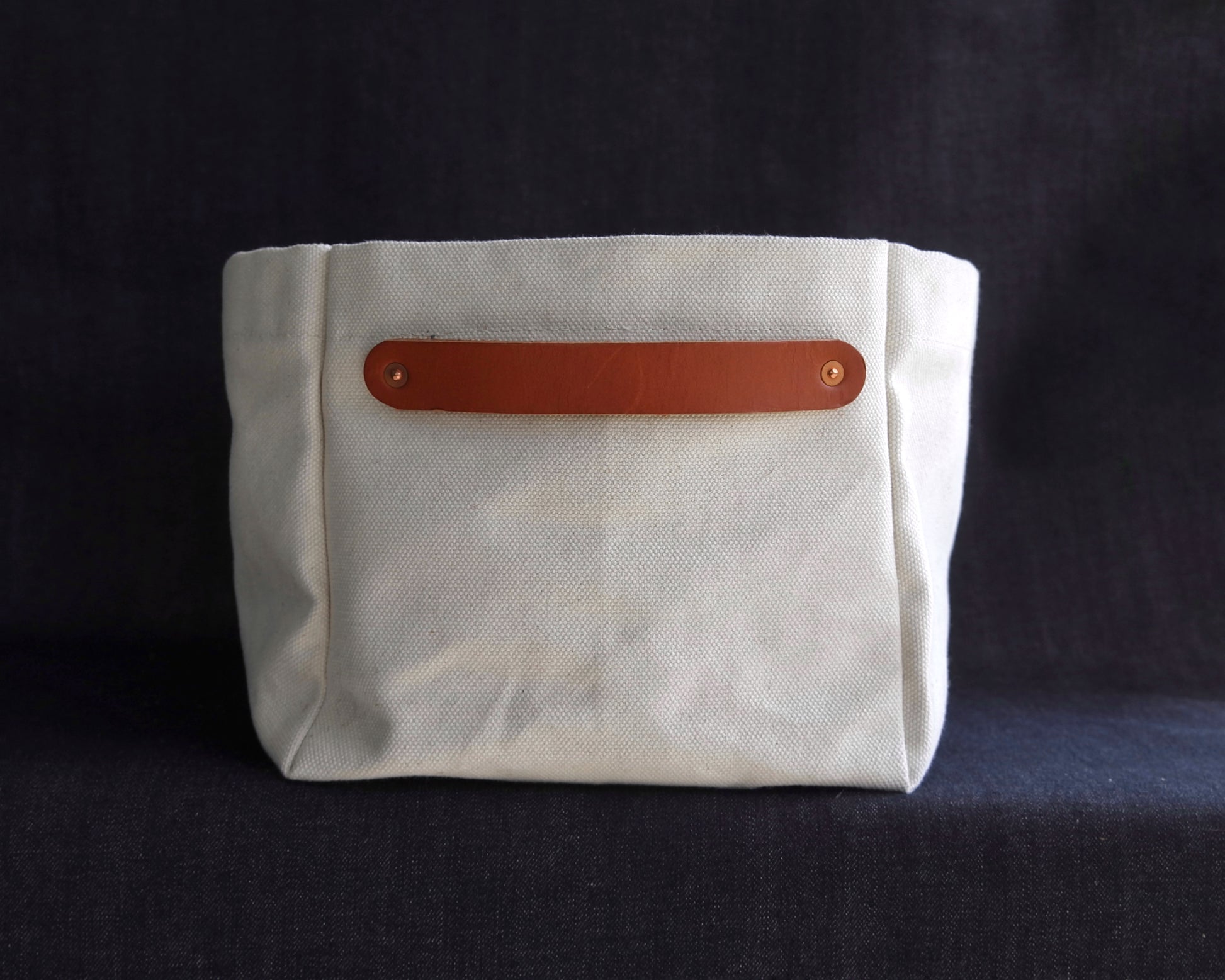 Made of a durable, industrial, natural canvas with thick leather handles on each end.