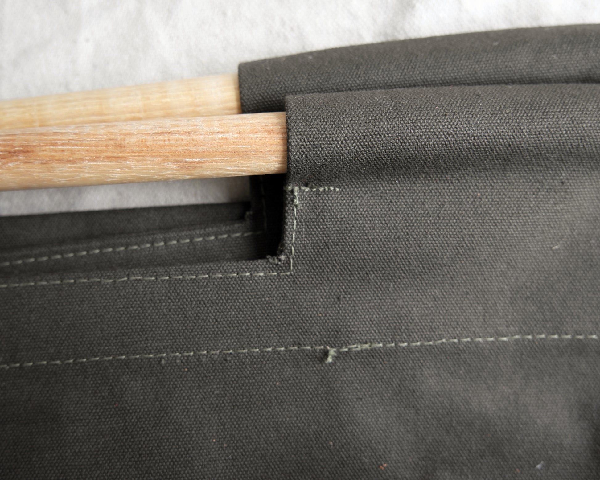Our Log Carrier is made from strong Army surplus cotton duck canvas in a cool grey or muted green, and sturdy hickory wood dowels, which were sanded and finished by hand with beeswax.