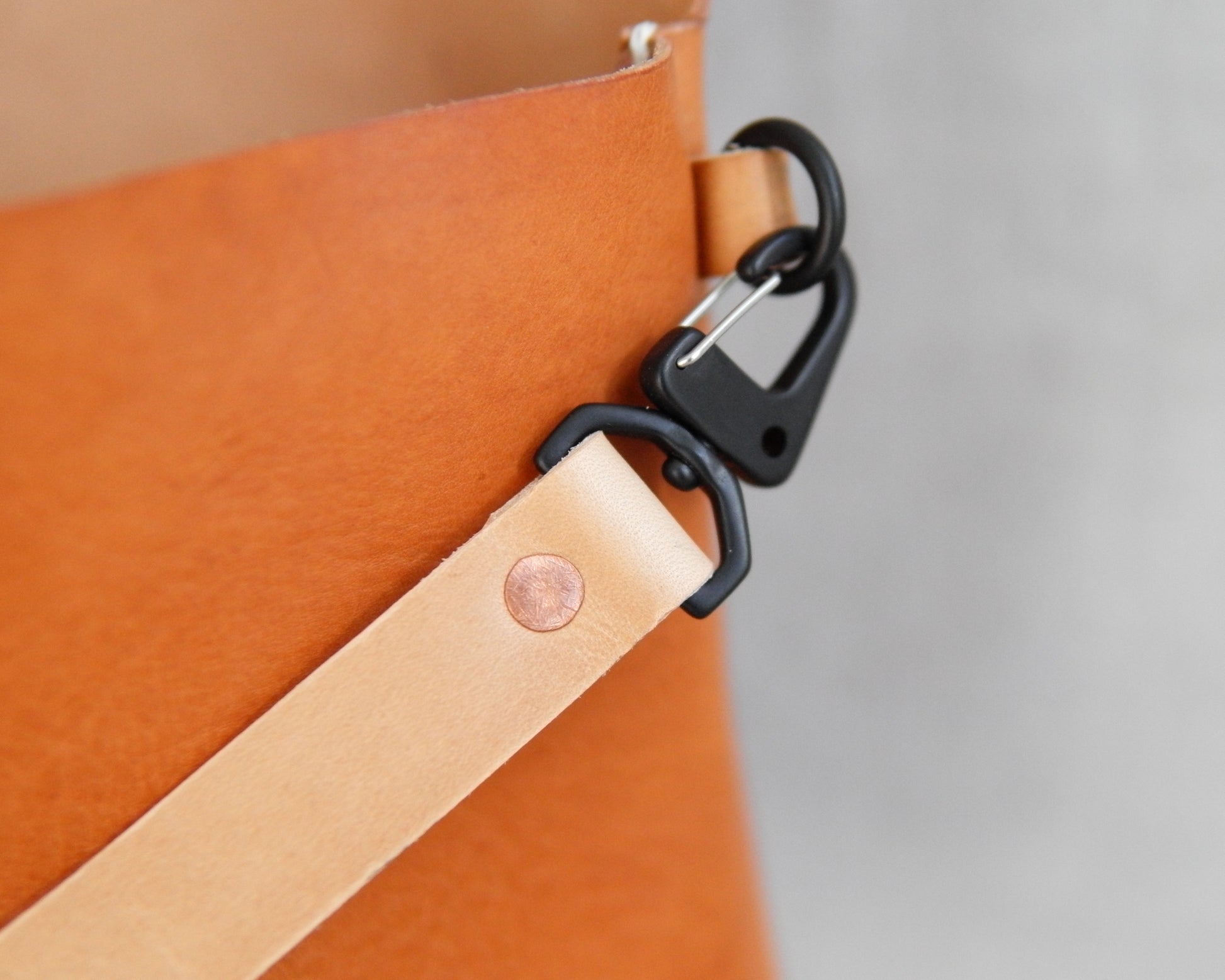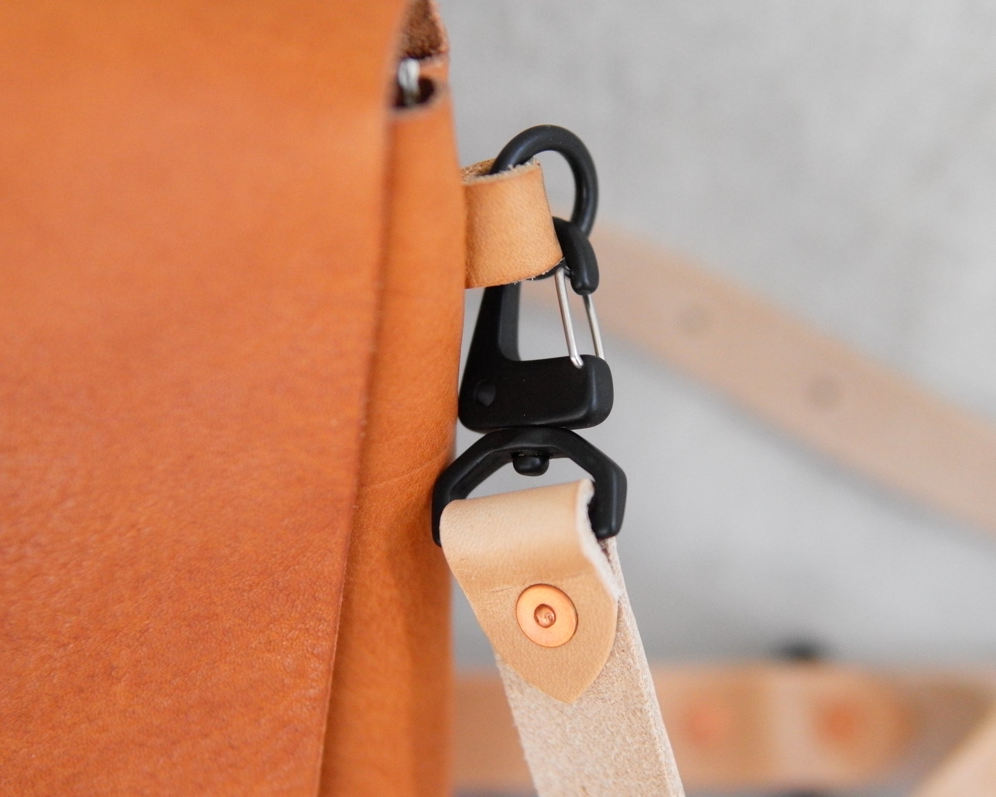 Adjustable strap in an Italian veg-tanned leather paired with black brass hardware (the strap is a natural leather that will darken very quickly to match the bag itself)